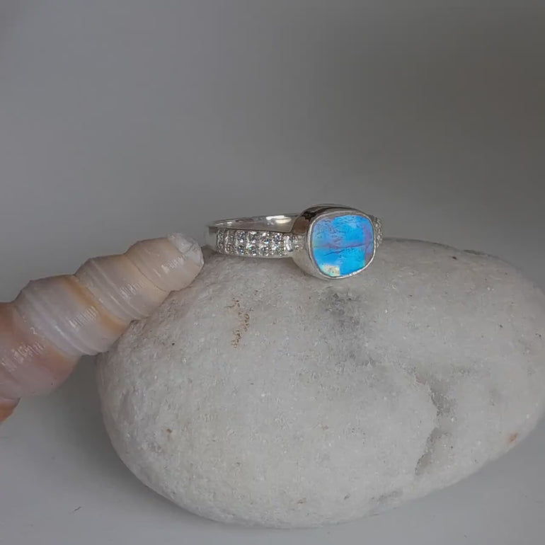 Raw Crystal Ring. We have around 200 types of Raw Crystals with us. In 2018, at a Gem show, I was arranging the goods for display and came across a beautiful Raw Moonstone piece. While turning it upside down, the Blue Flash hit me, as if the piece spoke to me. With help of my team member, we converted the Crystal into a ring for my daily wearing and inspiration.