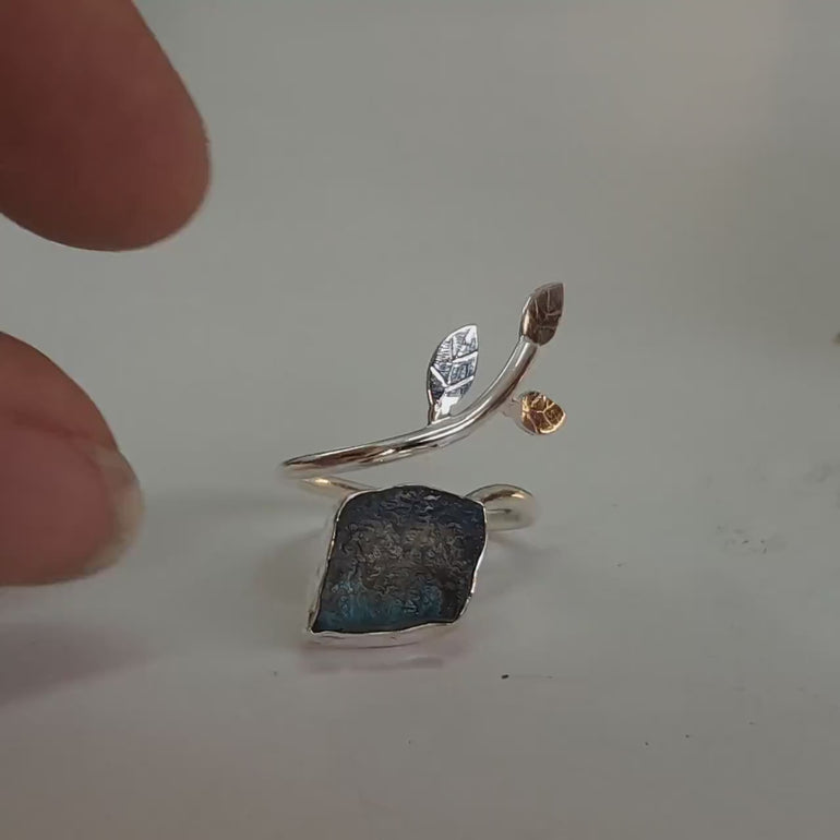 Raw Crystal Ring. We have around 200 types of Raw Crystals with us. In 2018, at a Gem show, I was arranging the goods for display and came across a beautiful Raw Labradorite piece. While turning it upside down, the Blue Flash hit me, as if the piece spoke to me. With help of my team member, we converted the Crystal into a ring for my daily wearing and inspiration.
