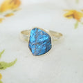Raw Crystal Ring. We have around 200 types of Raw Crystals with us. In 2018, at a Gem show, I was arranging the goods for display and came across a beautiful Raw Moonstone piece. While turning it upside down, the Blue Flash hit me, as if the piece spoke to me. With help of my team member, we converted the Crystal into a ring for my daily wearing and inspiration.